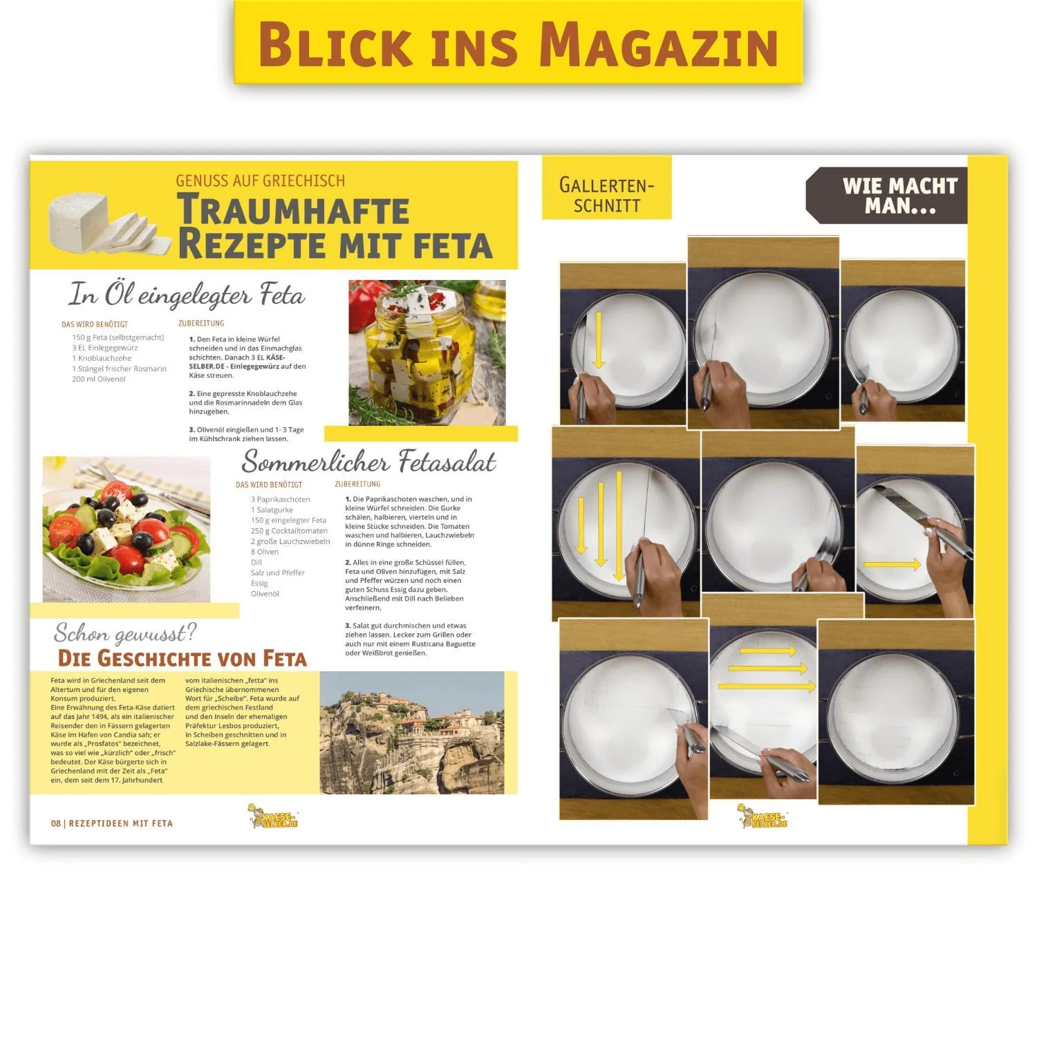 Unser aktuelles KAESE-SELBER.DE Rezeptmagazin bestehend aus 52 Seiten im hochwertigen und edlen Design ist voll gepackt mit Schritt für Schritt Anleitungen, bildlichen Erklärungen, tollen Rezeptideen, Anregungen, Interviews, Tipps und Tricks sowie Wissenswertes rund um das Thema Käse und Milchprodukte.